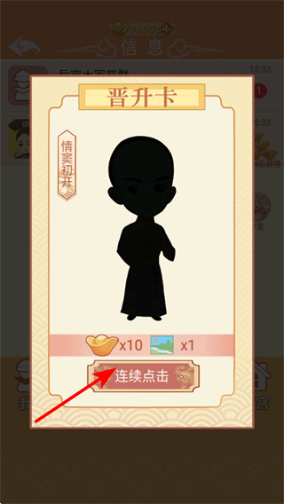 4、在晉升卡界面,連續(xù)點擊連續(xù)點擊按鍵,可獲取元寶、場景道具等獎勵,助力角色晉升,開啟階段。