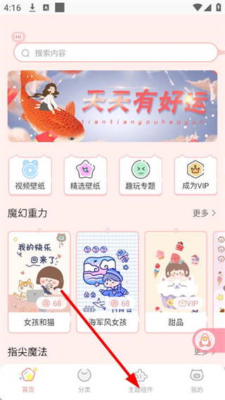 1、在APP首頁(yè),點(diǎn)擊底部主題組件,進(jìn)入主題組件頁(yè)面。