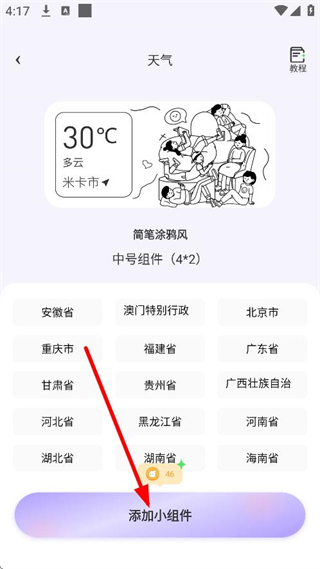 4、在組件詳情頁(yè)面,點(diǎn)擊添加小組件,完成天氣小組件添加操作。