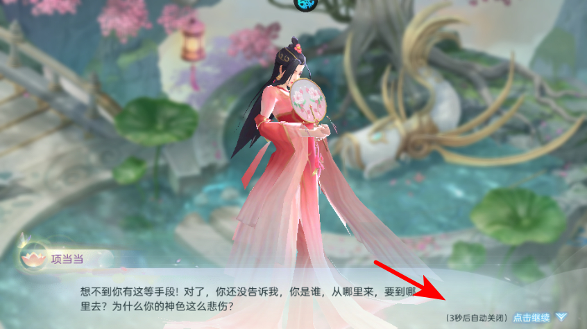1、在劇情對話界面,點(diǎn)擊點(diǎn)擊繼續(xù)按鍵,可推進(jìn)與項(xiàng)當(dāng)當(dāng)?shù)膭∏閷υ挘私庥螒虮尘肮适?,解鎖新的游戲內(nèi)容。