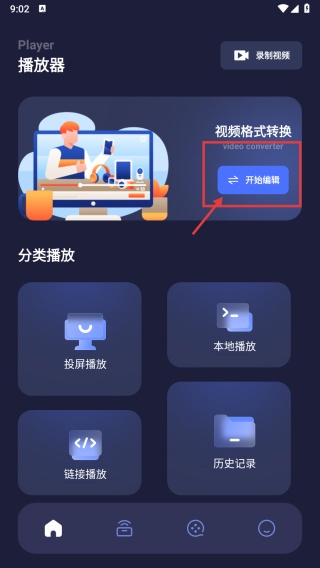 1、打開播放器APP,點擊視頻格式轉(zhuǎn)換板塊的開始編輯按鈕,進入視頻選擇頁面。
