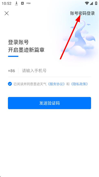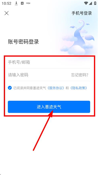 4、在輸入手機號/郵箱、密碼后點擊進(jìn)入墨跡天氣,完成賬號登錄操作。