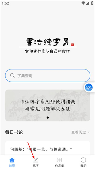 1、打開書法練字易,在首頁點(diǎn)擊練字,可進(jìn)入練字字體選擇頁面。