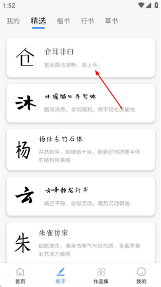 2、在練字字體選擇頁面,點(diǎn)擊喜歡的字體,可進(jìn)入該字體的練字頁面。