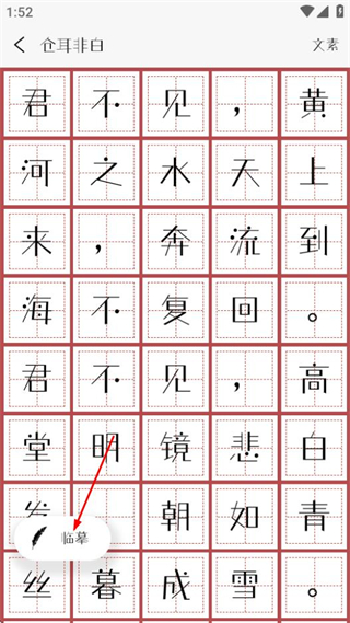 3、在練字頁面,點(diǎn)擊臨摹可進(jìn)入對于該字帖的臨摹練字界面。