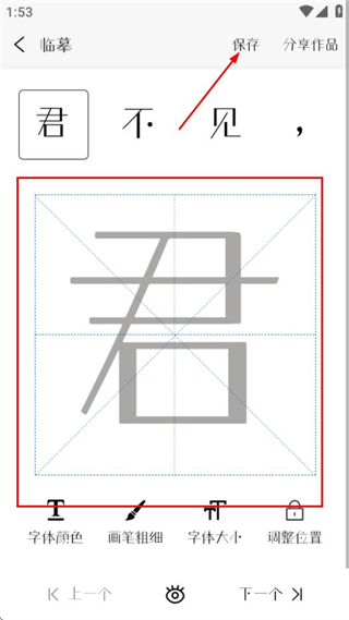 4、在臨摹練字界面,完成練字后點(diǎn)擊保存可保存練字作品。