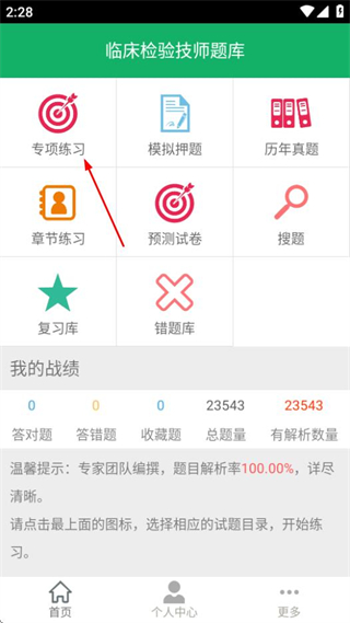 1、打開臨床檢驗技師題庫,點擊專項練習,可進入專項練習分類頁面。