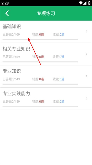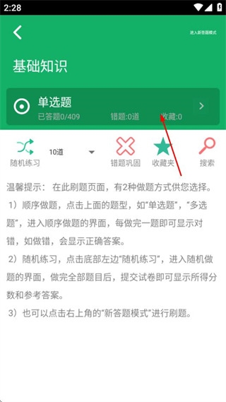 3、在基礎知識題型選擇頁面,點擊單選題可進入單選題答題界面。