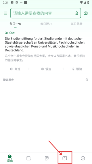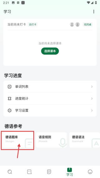 1、打開德語學(xué)習(xí)類APP,點(diǎn)擊底部學(xué)習(xí)選項(xiàng),進(jìn)入學(xué)習(xí)板塊頁面。