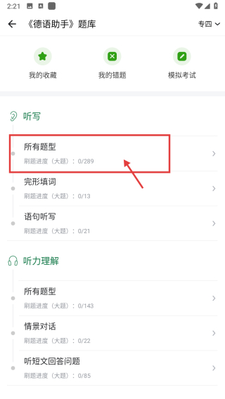 2、在學(xué)習(xí)板塊頁面,點(diǎn)擊德語題庫選項(xiàng),進(jìn)入德語助手題庫頁面。