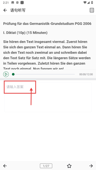 4、在語句聽寫練習(xí)頁面,在請(qǐng)輸入答案區(qū)域填寫德語聽寫內(nèi)容,完成練習(xí)操作。