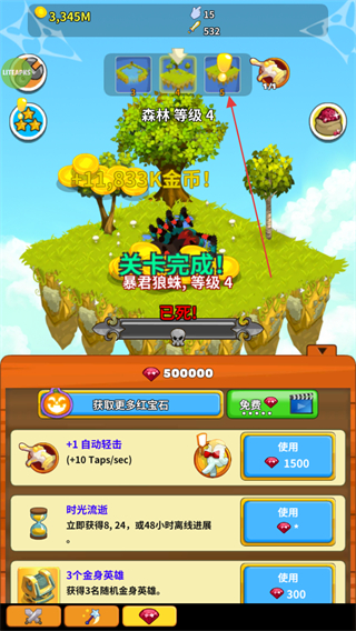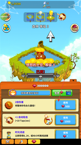 3、可使用紅寶石解鎖增益效果,如2倍傷害+1自動(dòng)攻擊等,提升攻擊效率,加快怪物擊殺速度。