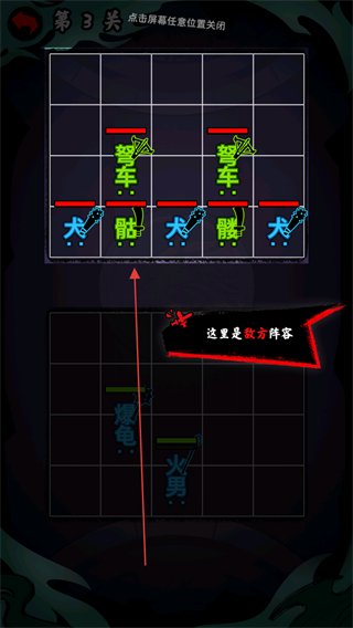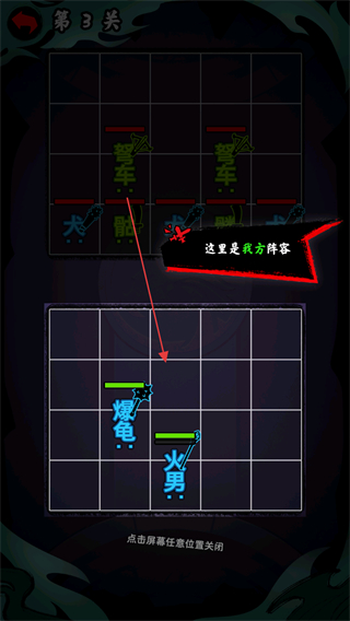 1、在關卡中如第3關,先查看敵方陣容如弩車、犬、髏和己方陣容如爆龜,了解雙方布局。