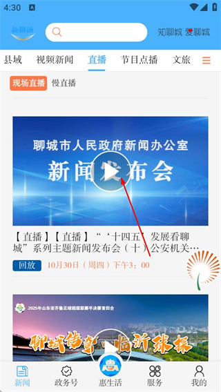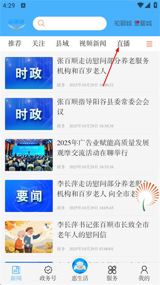 1、打開新聊城,在首頁點擊直播,可進入直播分類頁面。