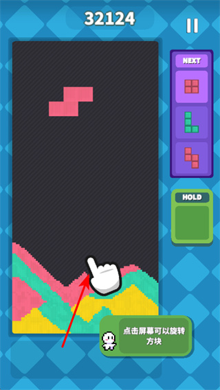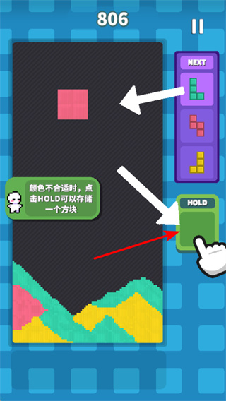 3、當方塊顏色不合適時,點擊HOLD按鈕可存儲當前方塊,切換到下一個方塊進行操作,靈活調整方塊的使用順序,優(yōu)化消除策略。