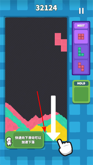2、快速向下滑動屏幕可讓方塊加速下落,在合適的時機使用該操作,能更快地完成方塊的放置,增加連續(xù)消除的機會,獲取分數(shù)。