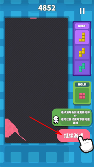 4、在游戲過程中,連續(xù)消除方塊可獲得更高的評分,同時還能解鎖使用下面的道具,點擊“繼續(xù)游戲”按鈕可繼續(xù)挑戰(zhàn),獲得分數(shù)。