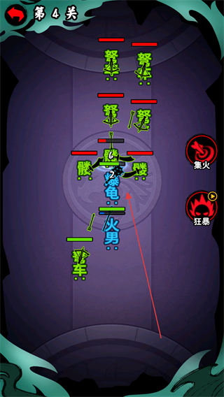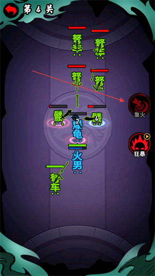 2、戰(zhàn)斗中操控己方角色爆龜、火勇等攻擊敵方單位,利用“集火”技能集中火力打擊單個敵人,快速削減其血量。