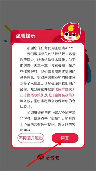 1、在溫馨提示彈窗中,點擊同意,進入畫啦啦美術(shù)課堂頁面。