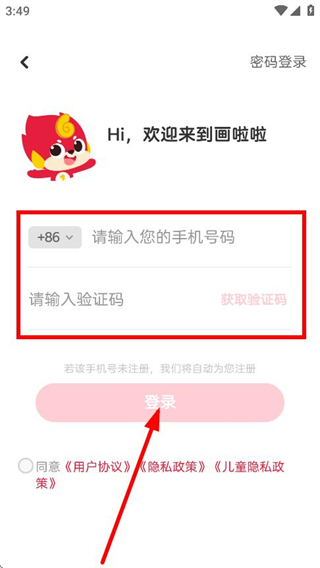 3、輸入手機號碼,點擊獲取驗證碼并輸入,點擊登錄,完成賬號注冊登錄操作。