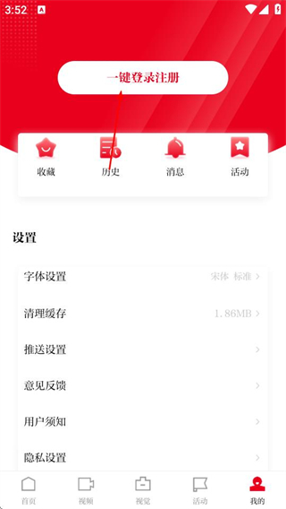 2、在個人中心頁面,點擊一鍵登錄注冊可進入手機號登錄注冊頁面。