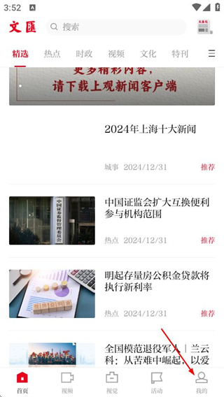 1、打開文匯,在首頁點擊頁面右下角我的,可進入個人中心頁面。