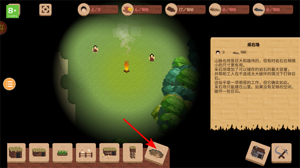 3、選擇采石場(chǎng)建筑,放置在合適的山地區(qū)域,開展采石工作,獲取石材資源,豐富資源種類,為后續(xù)建筑工具制作提供支持。
