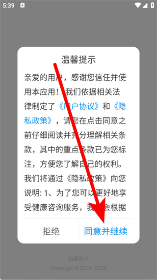1、打開和緩名醫(yī),在溫馨提示彈窗中,點(diǎn)擊同意并繼續(xù)。