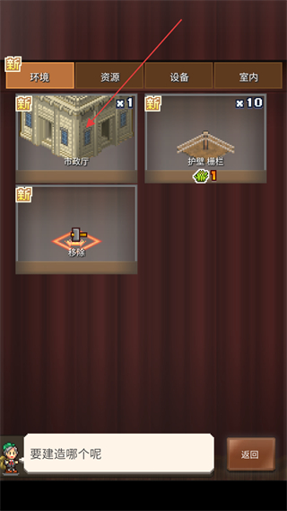 3、在環(huán)境、資源、設(shè)備、室內(nèi)不同的建筑種類中找到市政廳,雙擊選中。