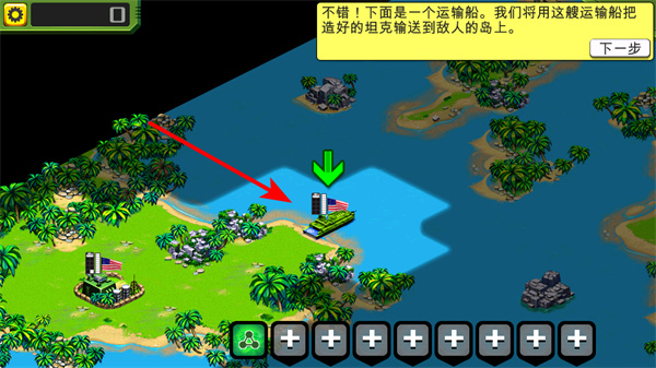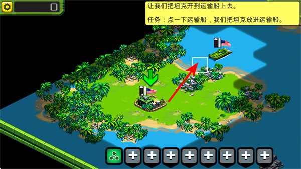 4、點擊運輸船,將坦克放入運輸船中,完成坦克的運輸部署,進而可向敵人島嶼發(fā)起進攻,占領基地以取得游戲勝利。