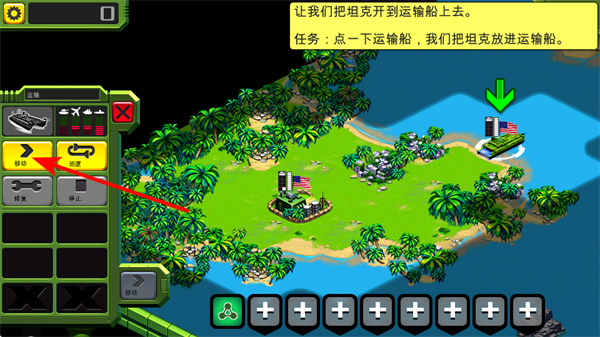 3、點擊移動按鈕,可操控坦克移動,將制造好的坦克開至運輸船處,通過精準的移動操作完成坦克與運輸船的銜接。