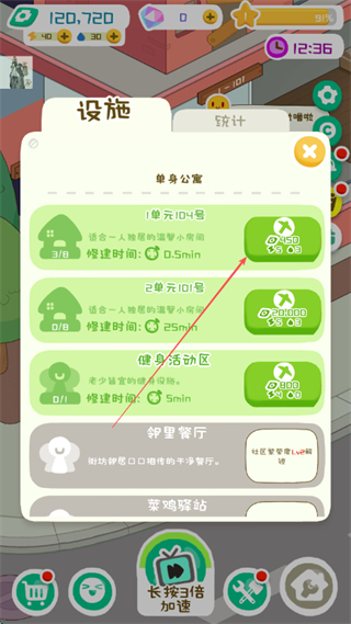 1、在設施界面修建單身公寓、健身活動區(qū)等設施,提升房產價值和收益。