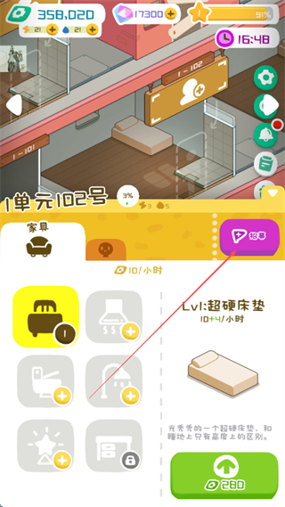 金幣可無限制投入公寓改造,從基礎家具到特色設施(如超級大圓床)均可快速解鎖升級,提升公寓居住品質。