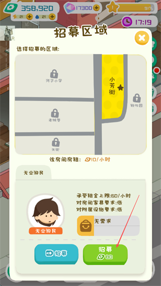 4、在招募區(qū)域選擇區(qū)域如小齊街,招募房客如無業(yè)游民,增加房屋出租率,獲取持續(xù)租金。