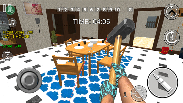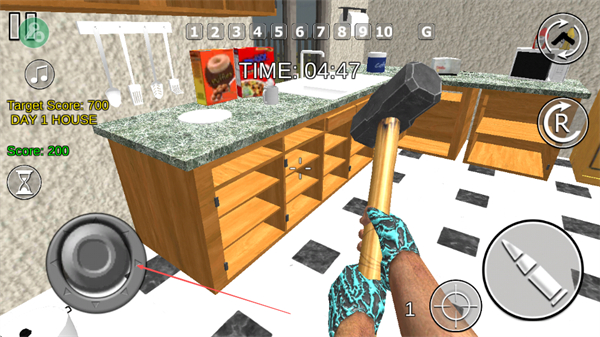 1、操控角色手持錘子,在廚房等場景破壞櫥柜、家電等物品,每破壞一處可獲得分數(shù)。