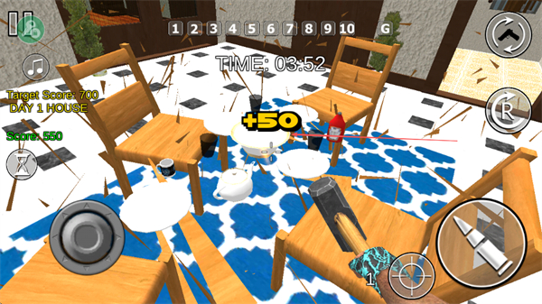 2、切換場景至餐廳,破壞桌椅、餐具等物品,持續(xù)積累分數(shù)。