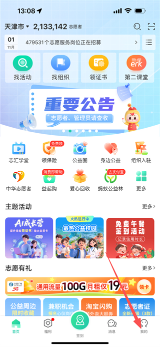1、在APP的首頁(yè),點(diǎn)擊底部我的,進(jìn)入個(gè)人頁(yè)面。