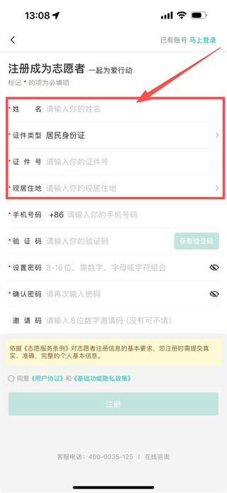4、在注冊(cè)成為志愿者頁(yè)面,填寫(xiě)姓名、證件類型、證件號(hào)、現(xiàn)居住地等必填信息。