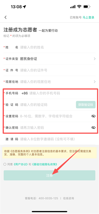 5、隨后填寫(xiě)手機(jī)號(hào)碼、驗(yàn)證碼、密碼等信息,勾選后點(diǎn)擊注冊(cè),完成賬號(hào)注冊(cè)操作。