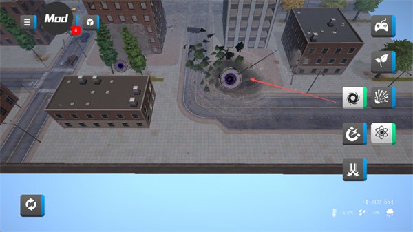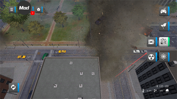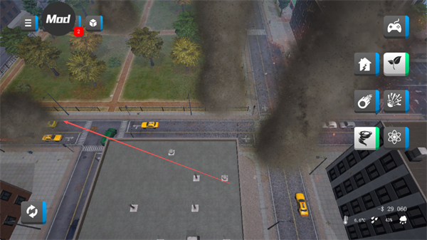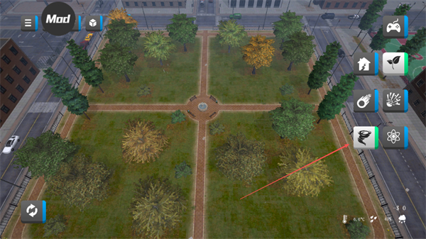 1、選擇右側(cè)的災(zāi)害工具如龍卷風(fēng)、核爆等,對城市區(qū)域如公園、街道釋放災(zāi)害。