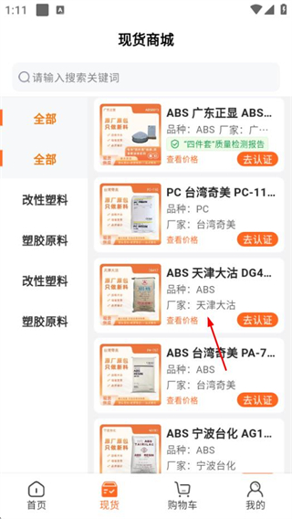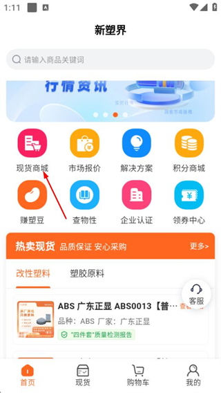 1、打開新塑界,點擊現(xiàn)貨商城,可進入現(xiàn)貨商品列表頁面。