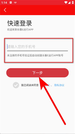 3、輸入手機(jī)號(hào)碼,勾選同意相關(guān)協(xié)議后,點(diǎn)擊下一步。