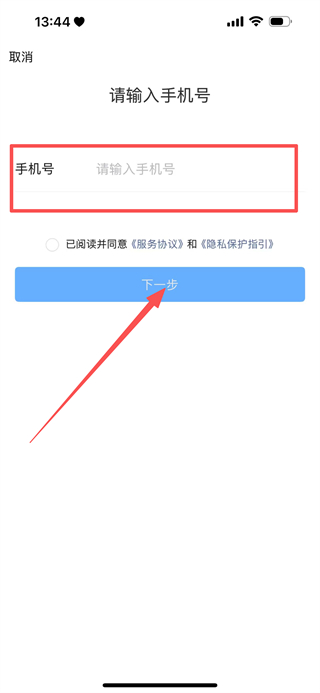 3、在手機(jī)號(hào)輸入頁面,輸入手機(jī)號(hào),同意后點(diǎn)擊下一步。