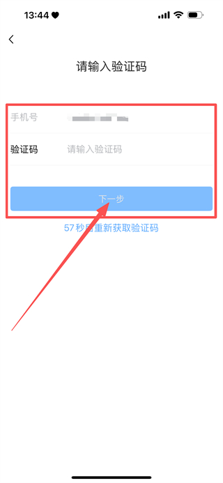 4、在驗(yàn)證碼輸入頁面,輸入短信驗(yàn)證碼后點(diǎn)擊下一步。