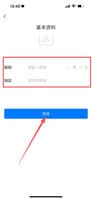 6、輸入昵稱、選擇地區(qū)后點(diǎn)擊完成,完成賬號(hào)注冊(cè)操作。