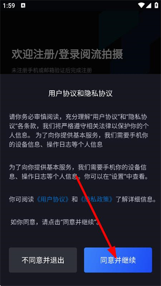 1、在用戶協(xié)議和隱私協(xié)議彈窗中,點擊同意并繼續(xù),進入頁面。