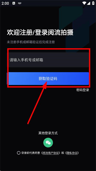 2、在登錄注冊頁面,輸入手機號或郵箱后點擊獲取驗證碼。