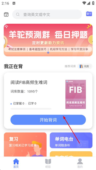 1、打開PTE單詞,點擊開始背詞,進入單詞學(xué)習(xí)頁面。