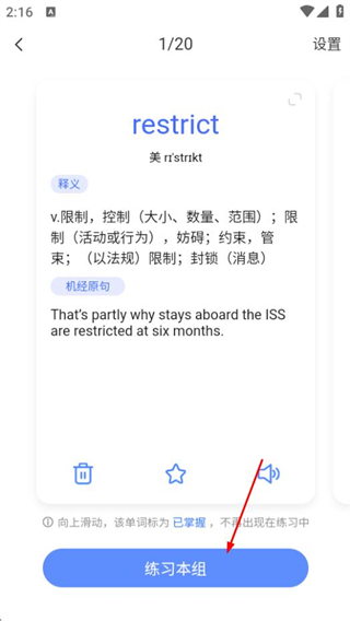 2、在單詞學(xué)習(xí)頁面,點擊練習(xí)本組,進入練習(xí)選擇頁面。