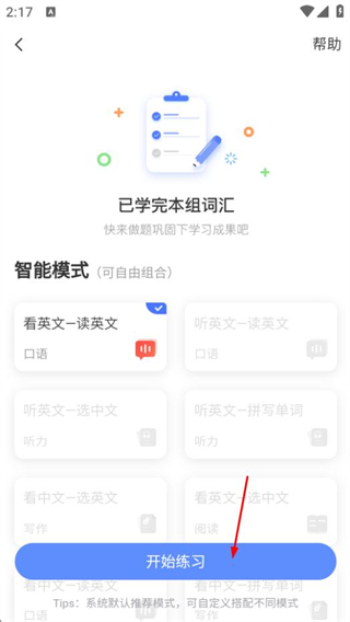 3、在練習(xí)選擇頁面,點擊開始練習(xí),進入單詞練習(xí)頁面。